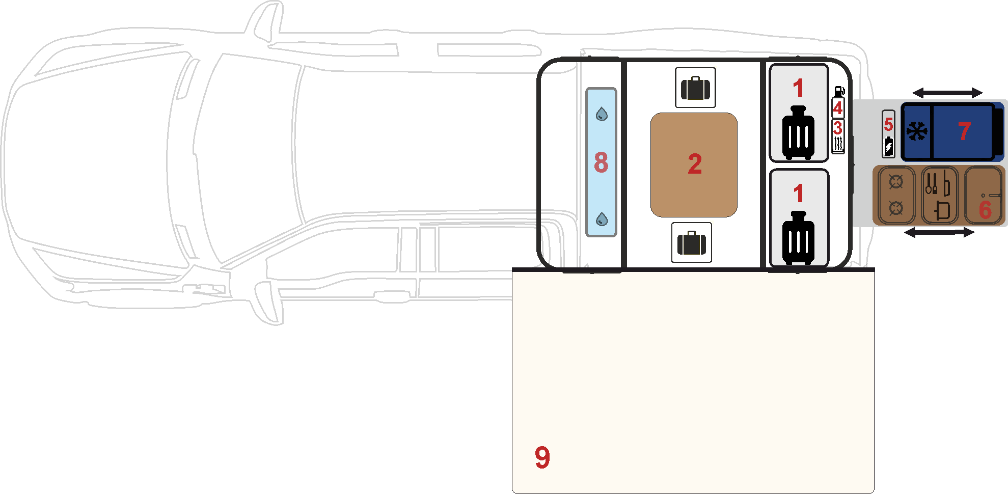 6. Кухонный модуль 7. Холодильник 8. Бак с водой 9. Маркиза
