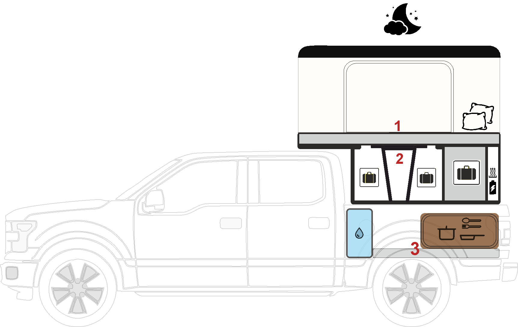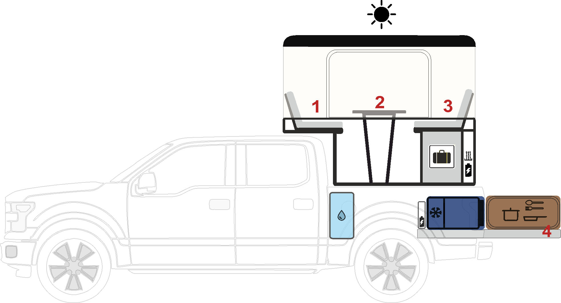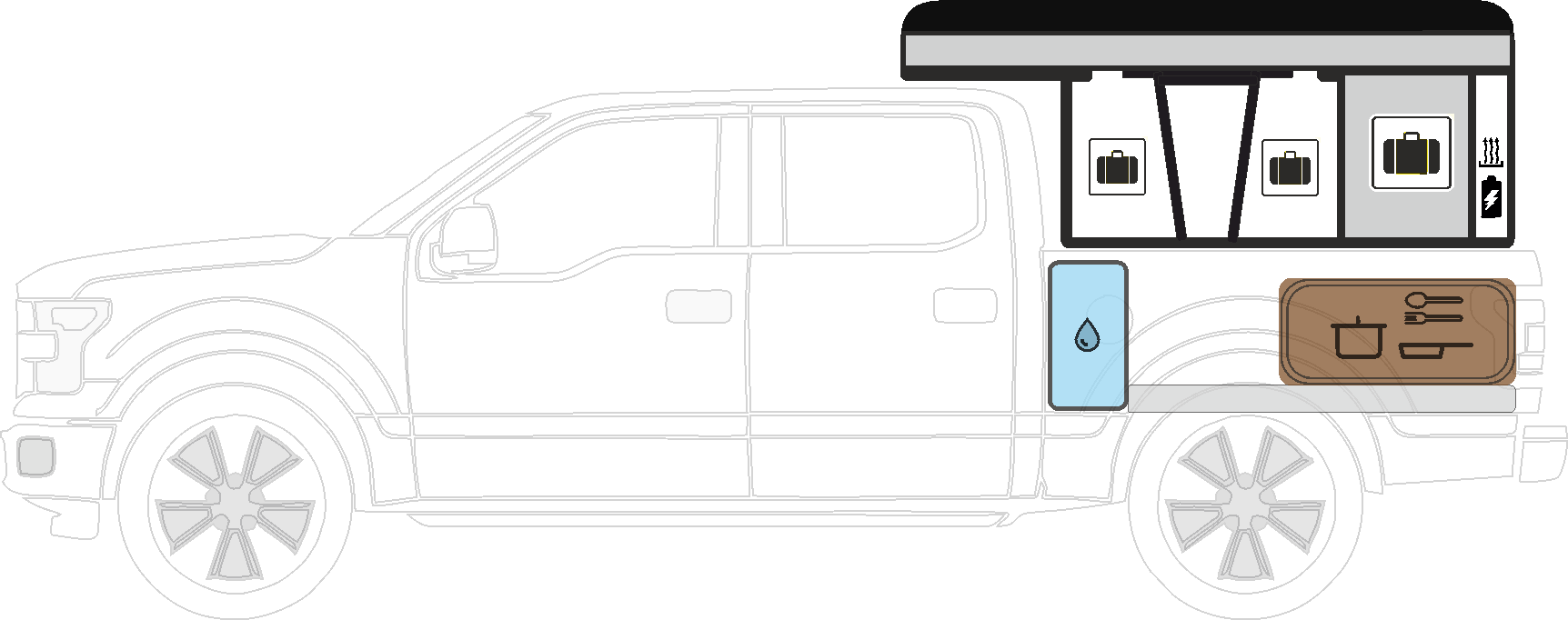 Кухонный блок на выдвижной платформе. Включает в себя столешницу, ящики для хранения, раковину, кран с помпой. Устанавливается на выдвижную платформу в кузов пикапа. Опционально в кузов может быть установлен бак с водой
